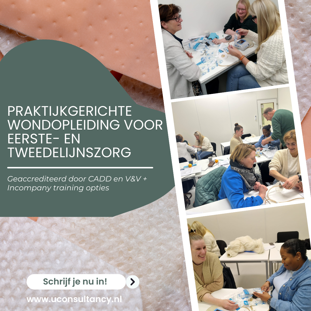 In de wondzorg zijn doktersassistenten, verzorgenden IG en verpleegkundigen op velerlei velden binnen de gezondheidszorg werkzaam. Zij zien vaak patiënten, bewoners of cliënten met een wond. Dit vergt naast kennis die je hebt opgedaan in de beroepsopleiding, specifieke kennis over wonden. Daarom heeft U-Consultancy een 5-daagse opleiding ontwikkeld waarin het ontstaan van wonden, wondgenezing en wondbehandeling centraal staan. Met deze opleiding leert u alles op het gebied van dermatologie rondom de wond, maar wordt u geen wondverpleegkundige. Wilt u zich ontwikkelen tot wondverpleegkundige, klik dan hier.